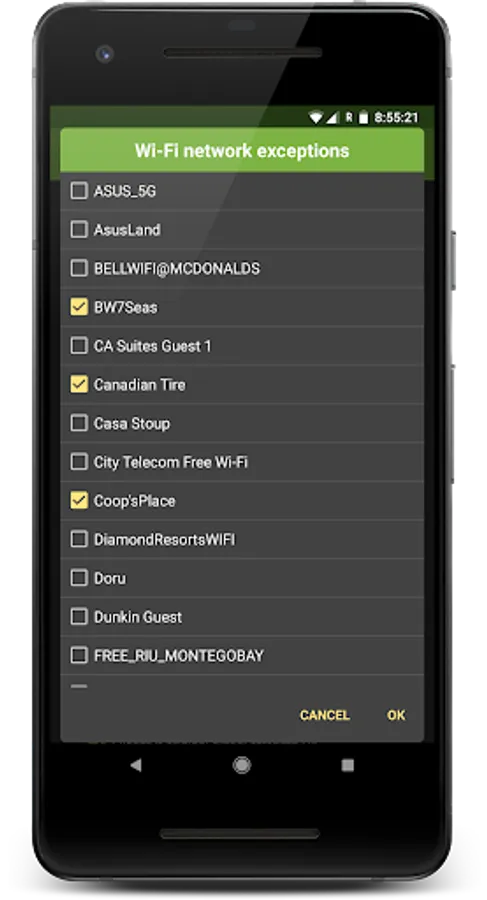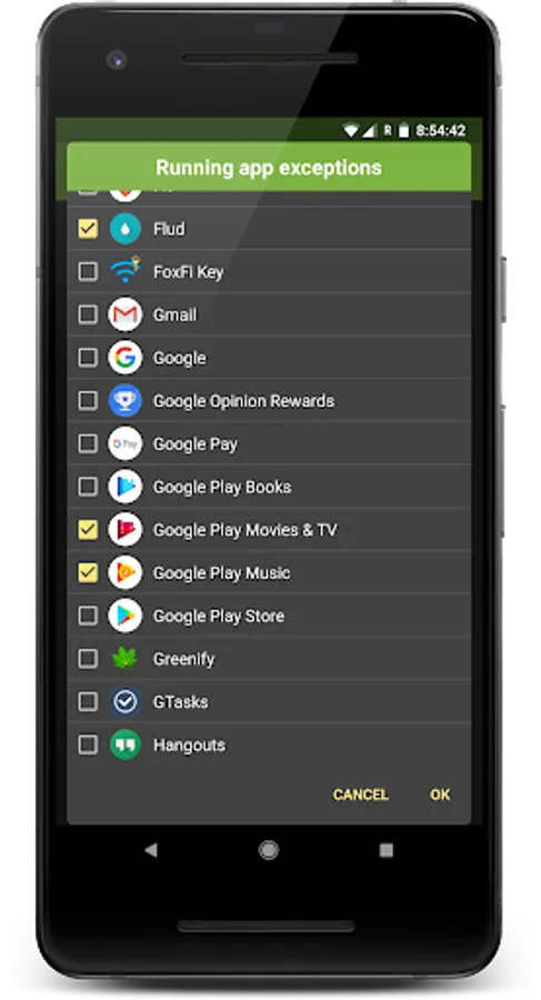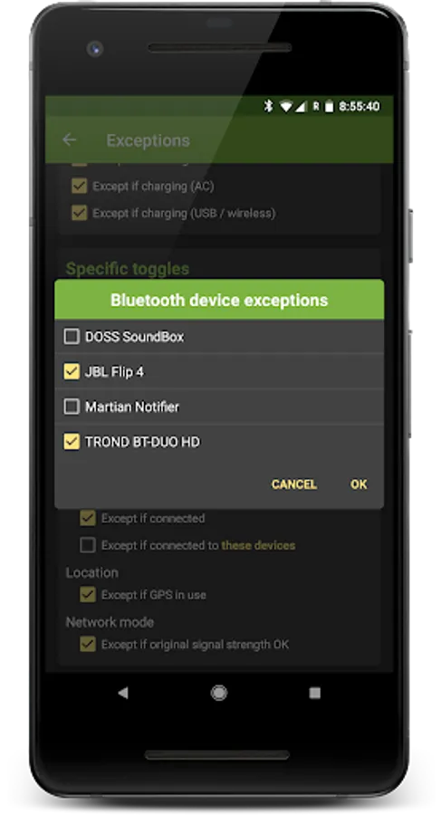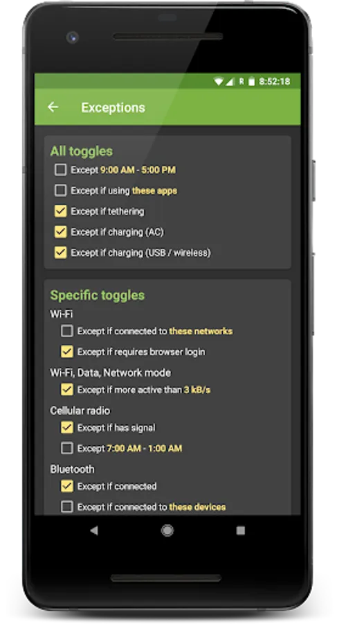 • Set exceptions for certain apps running (req. root on 8.0+)