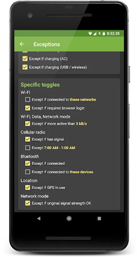 Various options that prevent connections from being disabled. Options under the "All toggles" section will prevent all connections from being disabled. Options under "Specific toggles" will only prevent the respective connections from being disabled. If an exception is found, LD will check again after another disable time interval has passed.