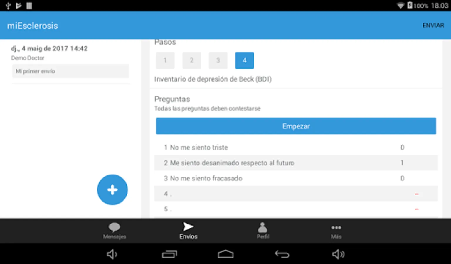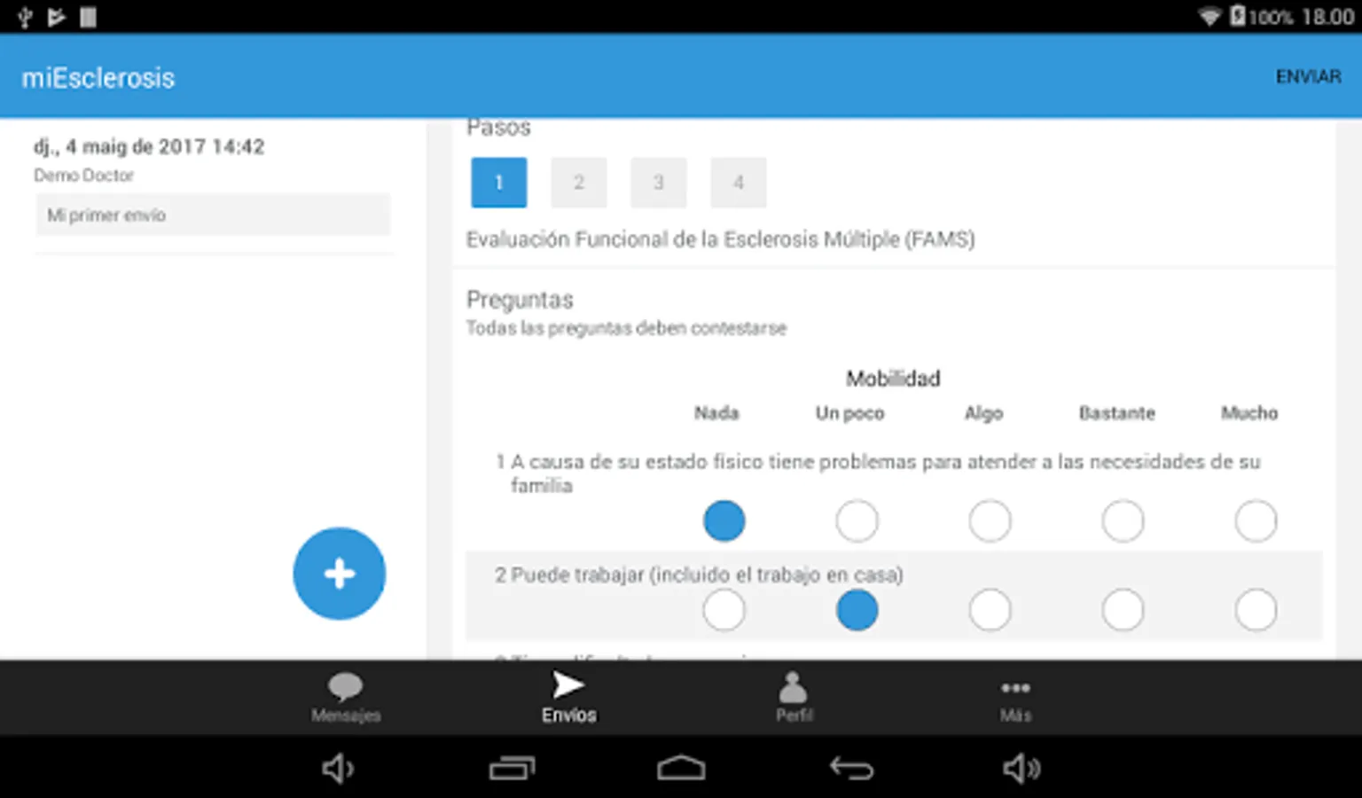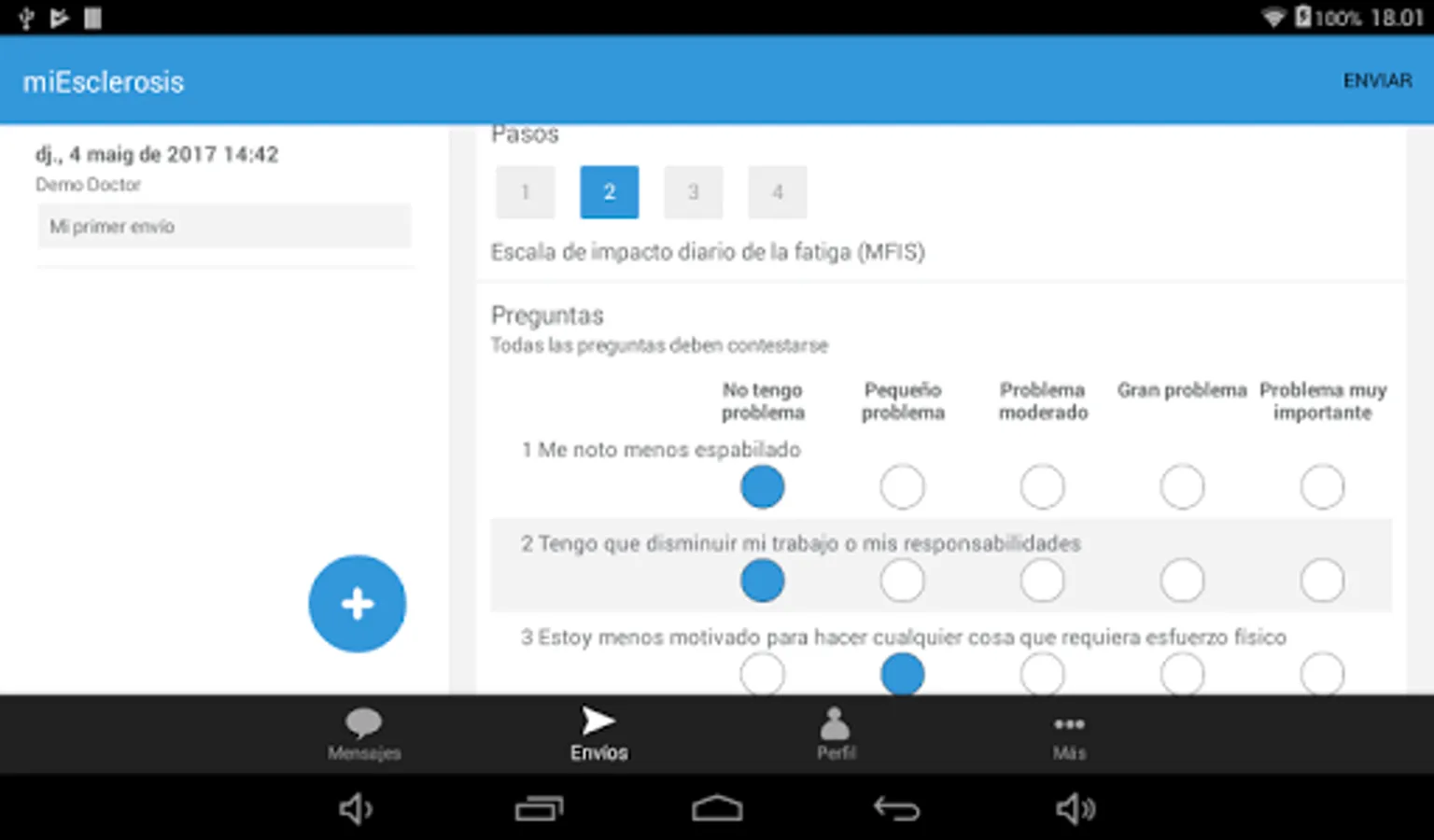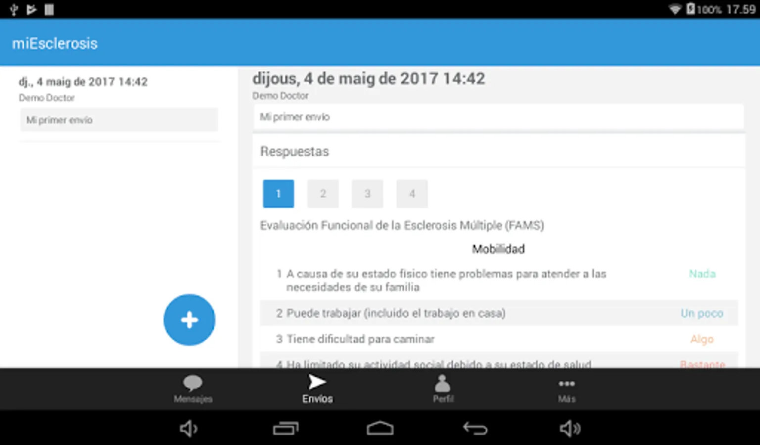 This app allows patients with Multiple Sclerosis, or their families, inform your Neurologist so you can assess their current state and evolution.