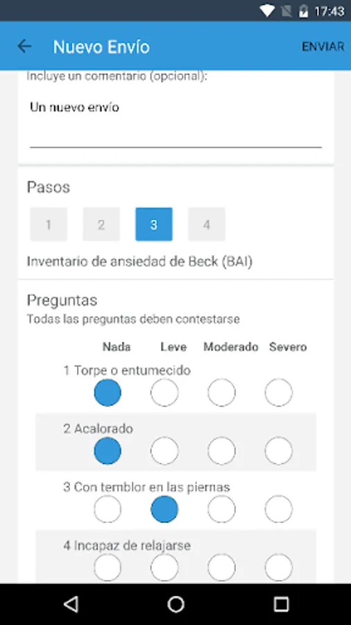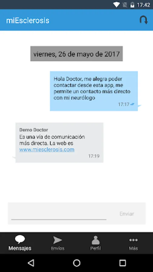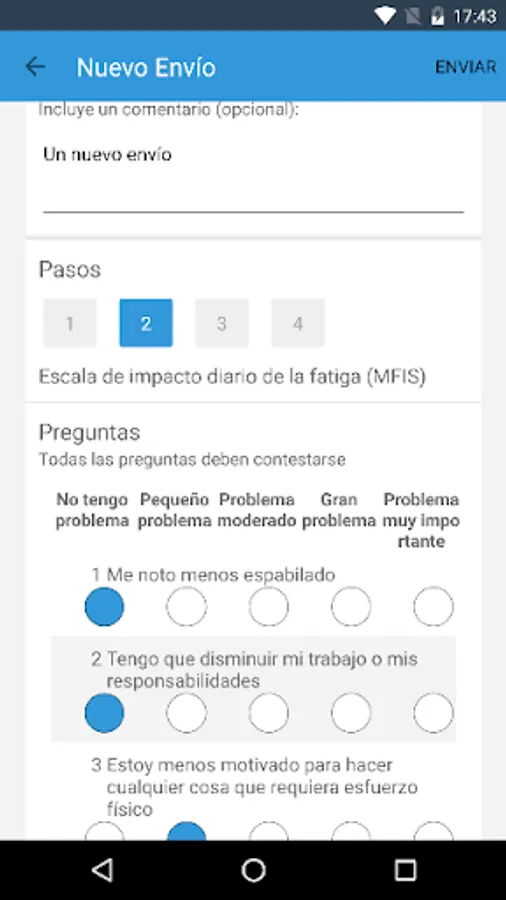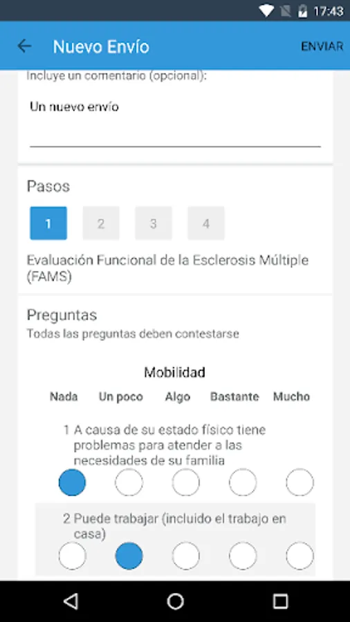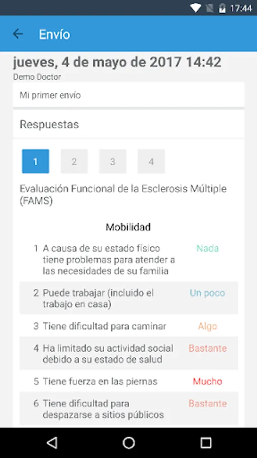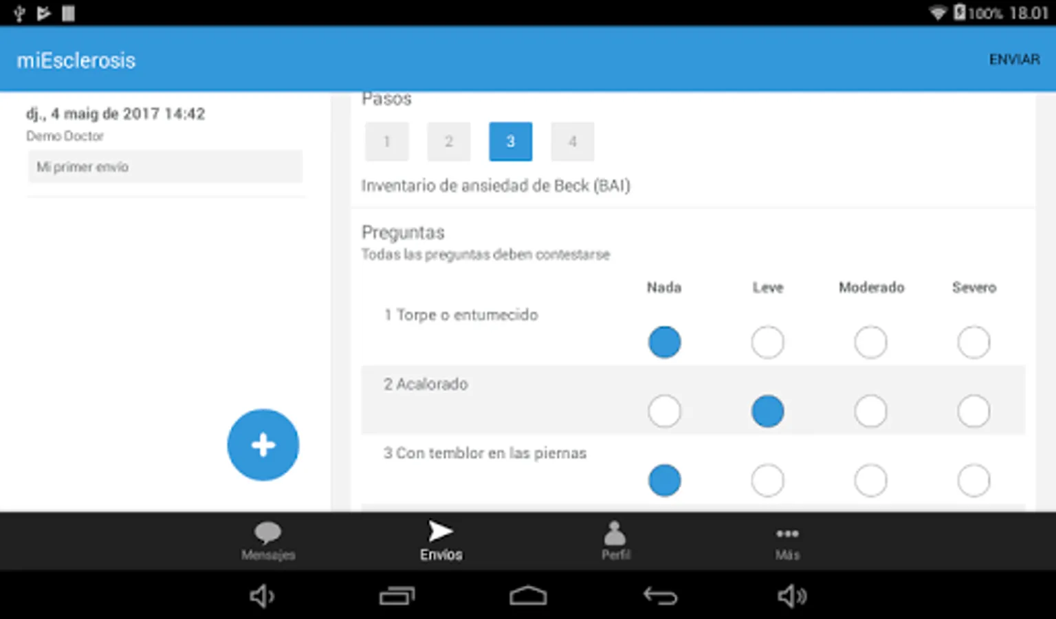 This app allows patients with Multiple Sclerosis, or their families, inform your Neurologist so you can assess their current state and evolution.
