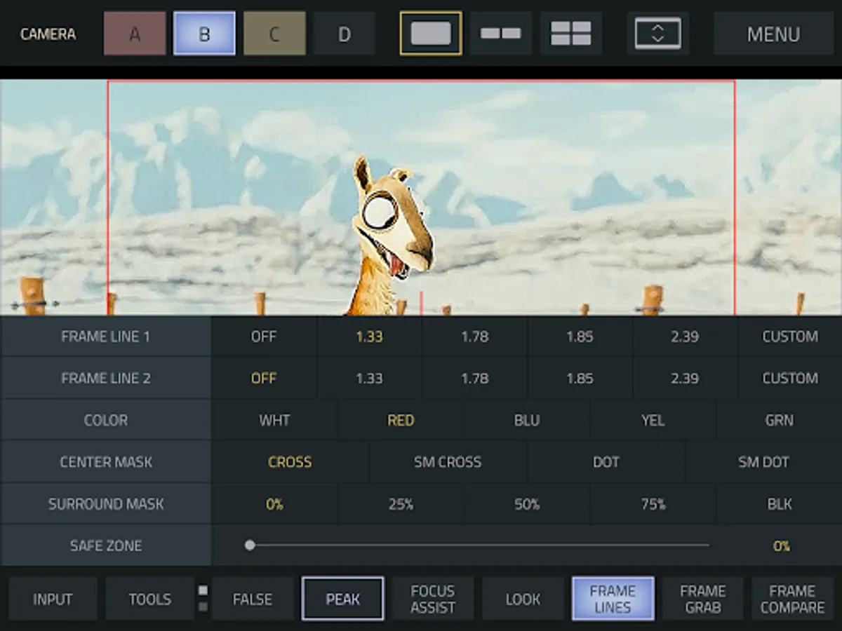 FRAMELINES–Adjust 2 sets of preset or custom aspect ratio created with a simple function (x:x), Frameline Color, Center mark, Surround Mask opacity, and Safe Zone %