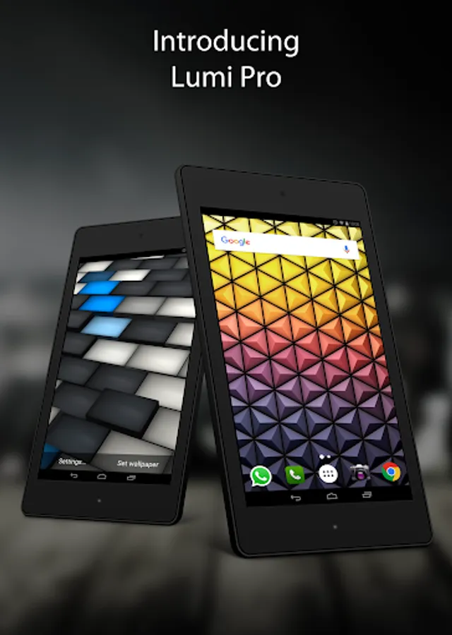 Lumi is a full 3D live wallpaper with brilliant 3D tiles that sparkle up and move in waves as you interact with them. The app comes with many vibrant or classy color themes and many different geometric shapes and patterns (gems, honeycomb, box tiles, etc.), and new themes are being added constantly by our team. You can set the color themes to shuffle every once in a while, or triple-tap to switch between them.