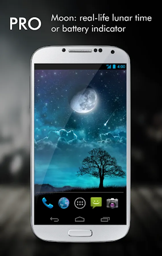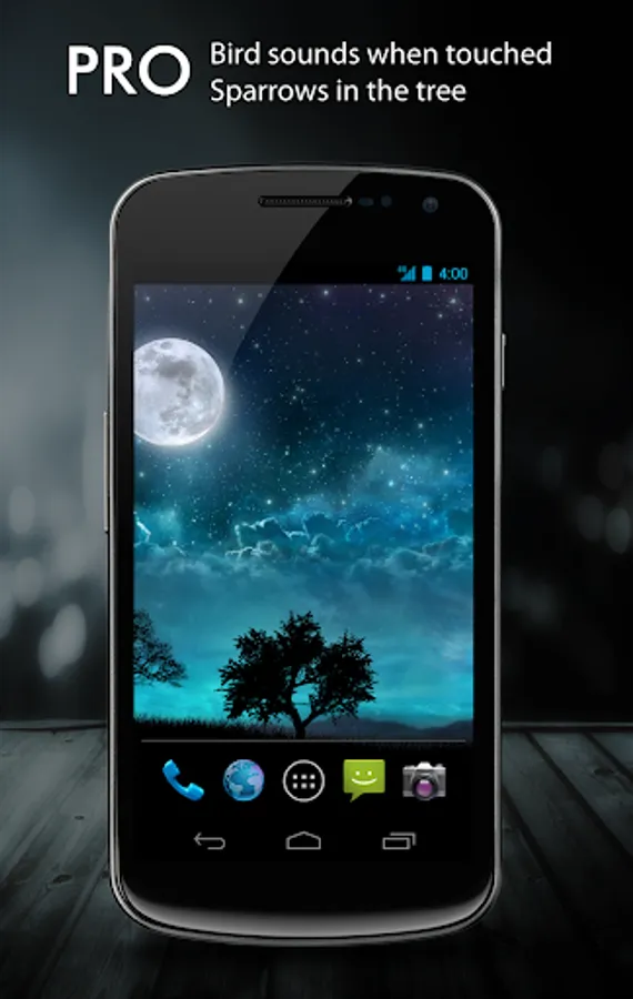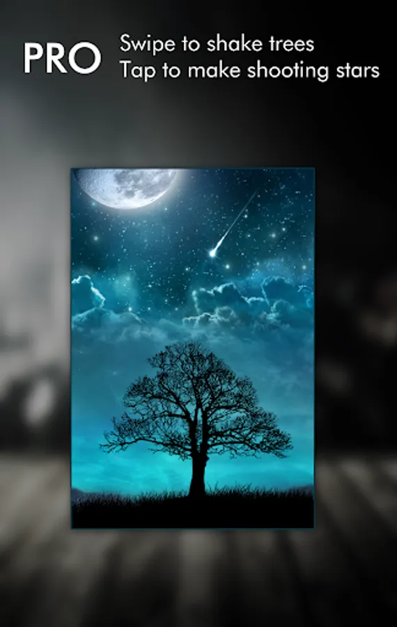 This live wallpaper features a relaxing night scene, with dreamy blue color tone, sparkling and shooting stars and tree silhouette. When you swipe to change home screens, the scene moves with parallax effect to simulate 3D space.