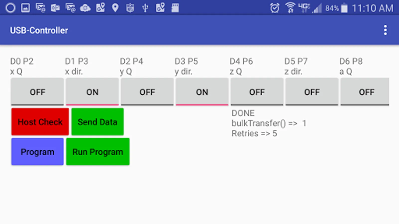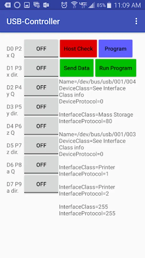 Turn your smartphone into a microcontroller. The USBController app is for controlling hobby lights or motors through an Android device's USB-OTG (On The Go) port. This app allows you to set (turn on) or clear (turn off) up to eight signals (Data D0 through D7). To use this app, you need to plug together your own harness from an Android device with USB-OTG hardware support to a IEEE-1284 parallel printer port. You do not need a separate Arduino controller as other apps require. After that you need to build your own light or motor interface to the parallel ports binary outputs. For more details, please visit http://terakuhn.weebly.com/phone_usb_controller.html.