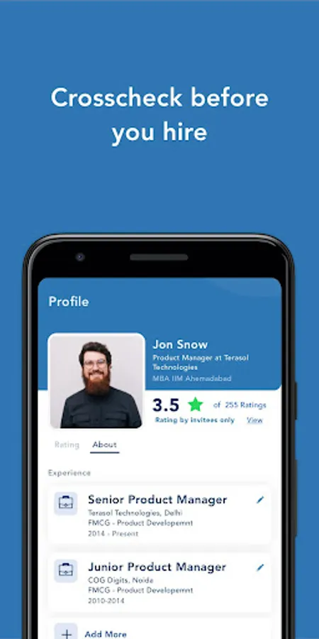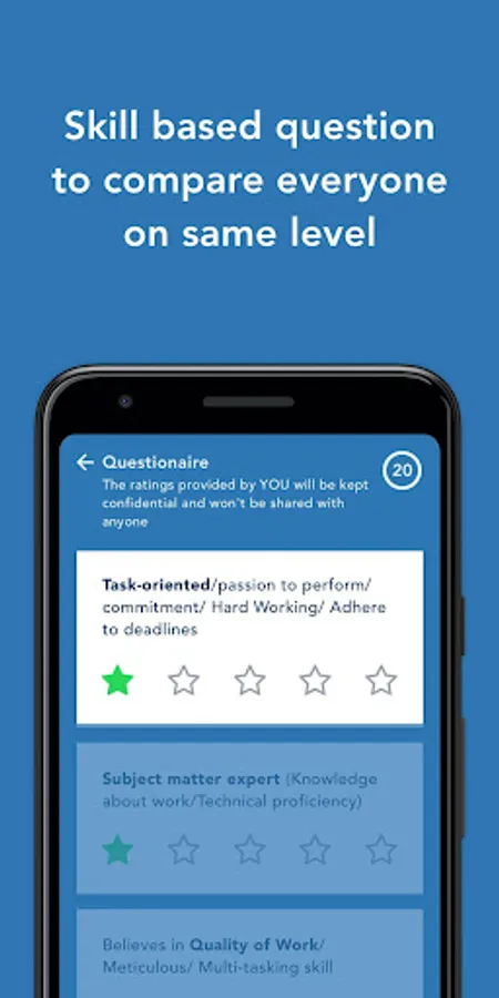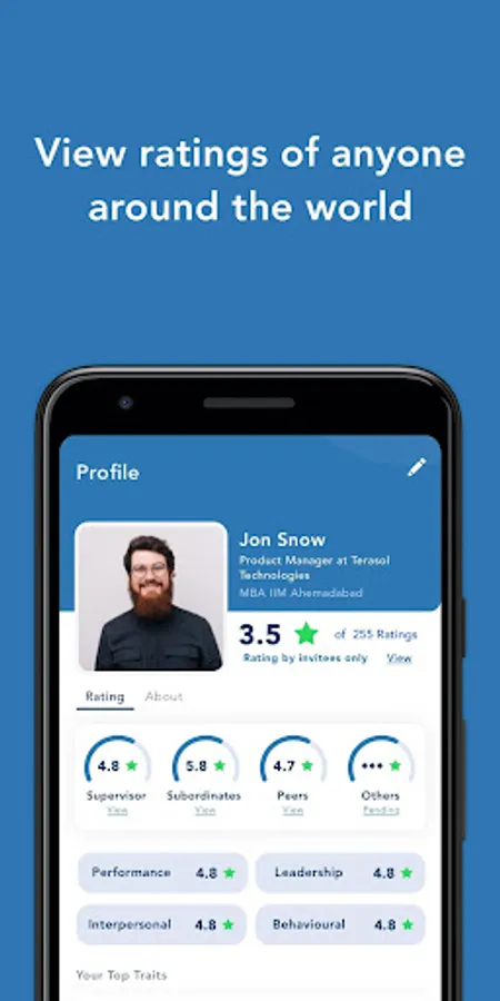 A Rating App that provides 360 degree Appraisal of an individual/professional, done by his/her Supervisors, Peers/stakeholders, Subordinates, acquaintances in their individual capacity, across 20 critical Traits. To assist Interviewers, select required skill set.