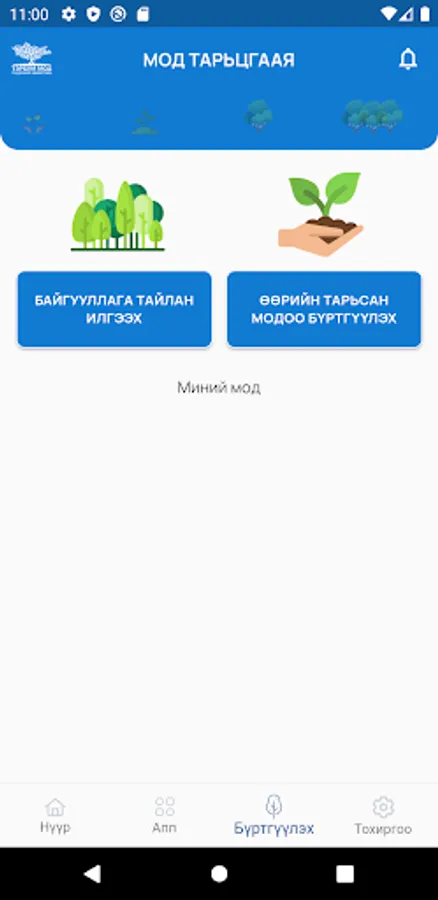 Тэрбуммод аппликейшнийг ашиглан Тэрбум мод үндэсний хөдөлгөөнд хамрагдаж мэргэжлийн ойн инженер, тусгай газар бүхий төгөл, мод үржүүлгээс сонгон өөрийн модыг тариарай