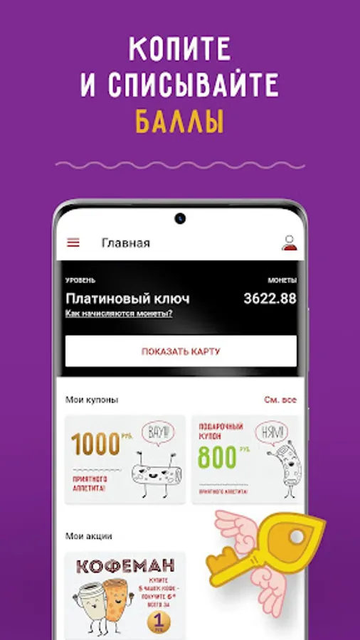 At the checkout, before paying for the order, inform that you want to use Coins. Open the main page of the application, click "show map" and dictate the digital code to the cashier. 1 coin is 1 ruble of your discount.