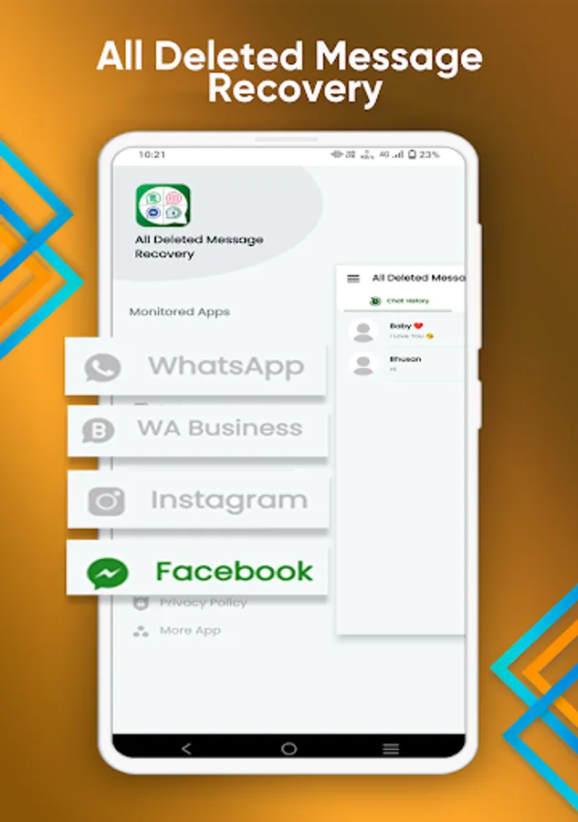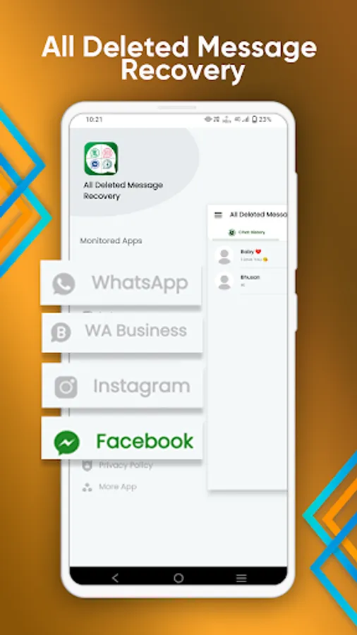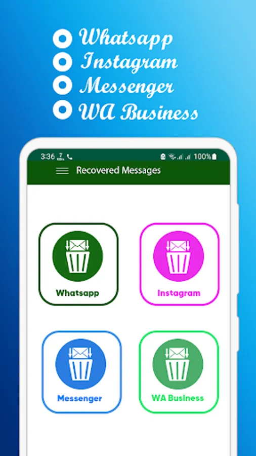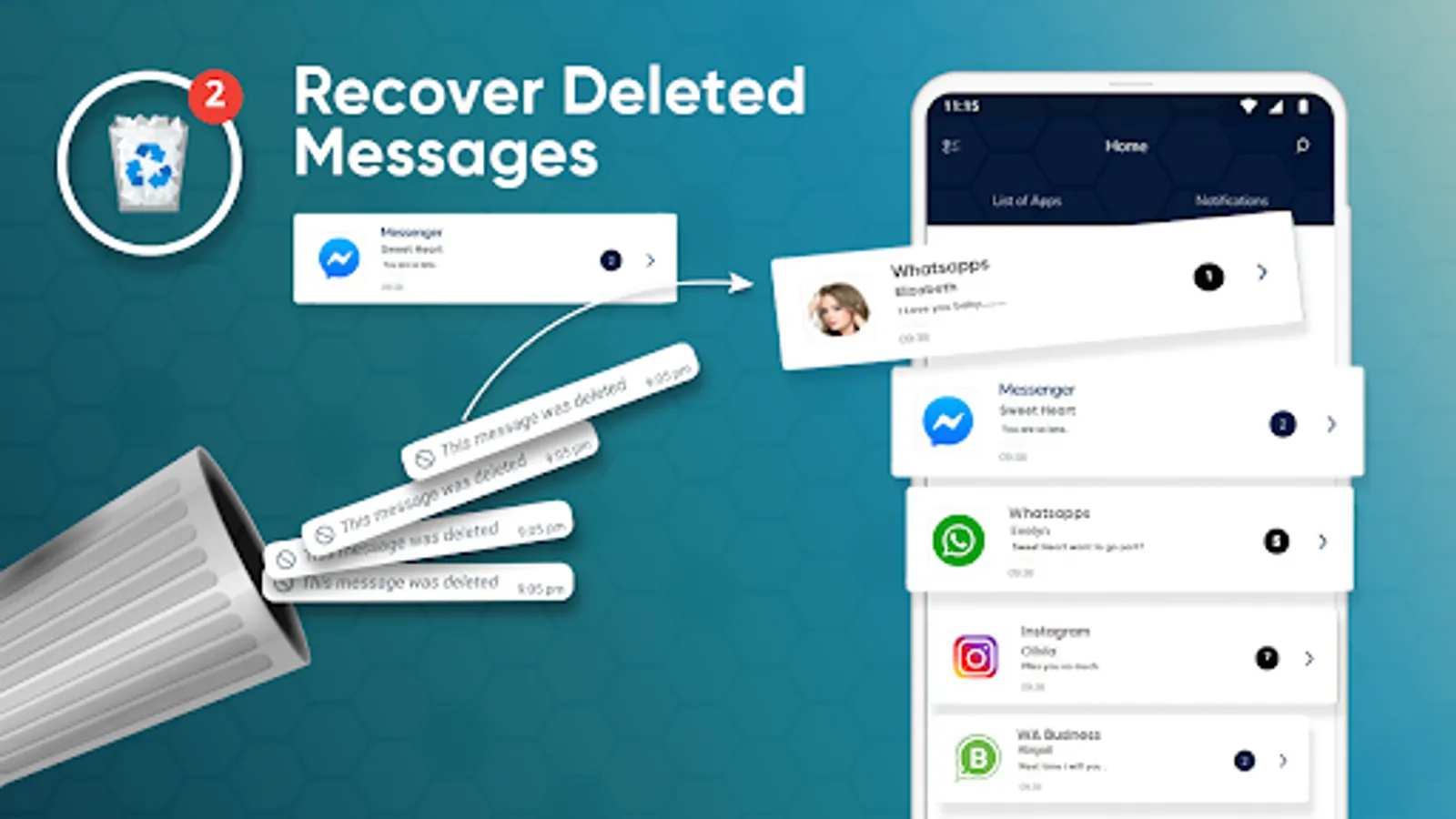 All Deleted Message Recovery : Never miss anything on your favourite messaging platforms. Restore deleted text messages. View and recover deleted messages easily from whats app, instagram & messenger.