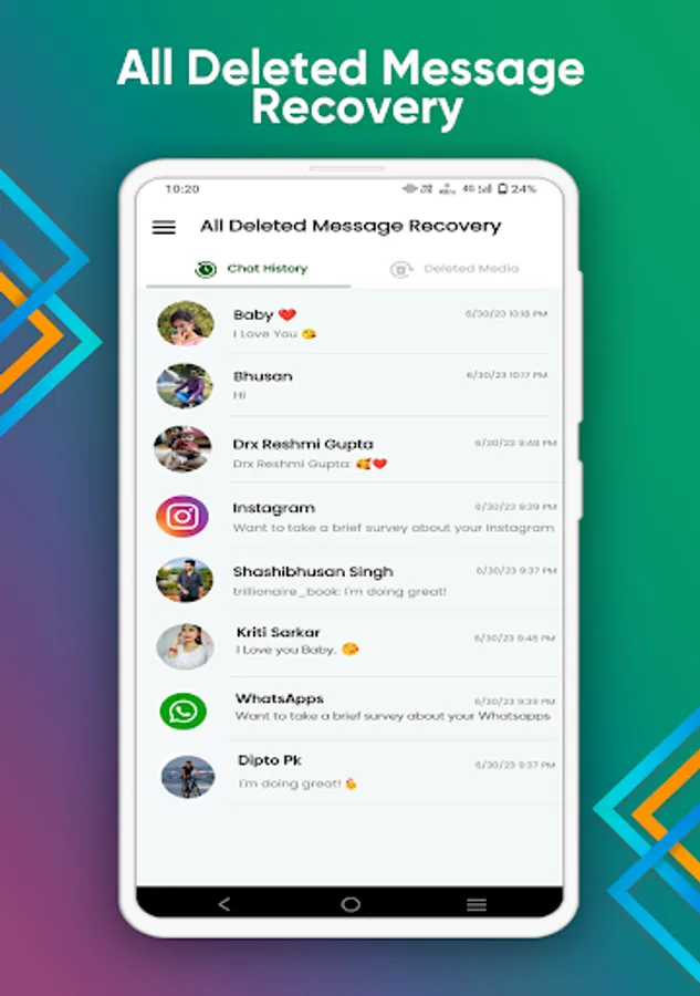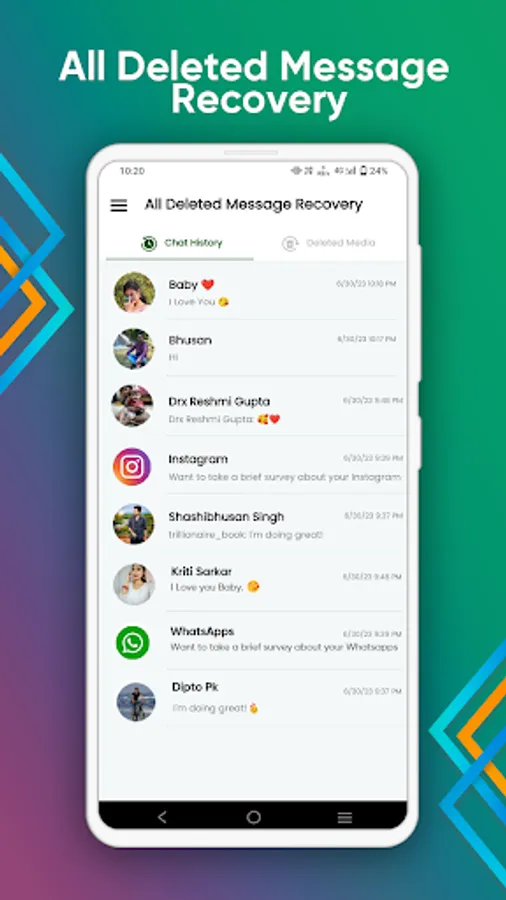 Recover All Deleted Messages is the best app to all recently deleted unseen messenger messages. If a person deletes the unseen messenger message he has sent. Just open the app and view all deleted text chat.