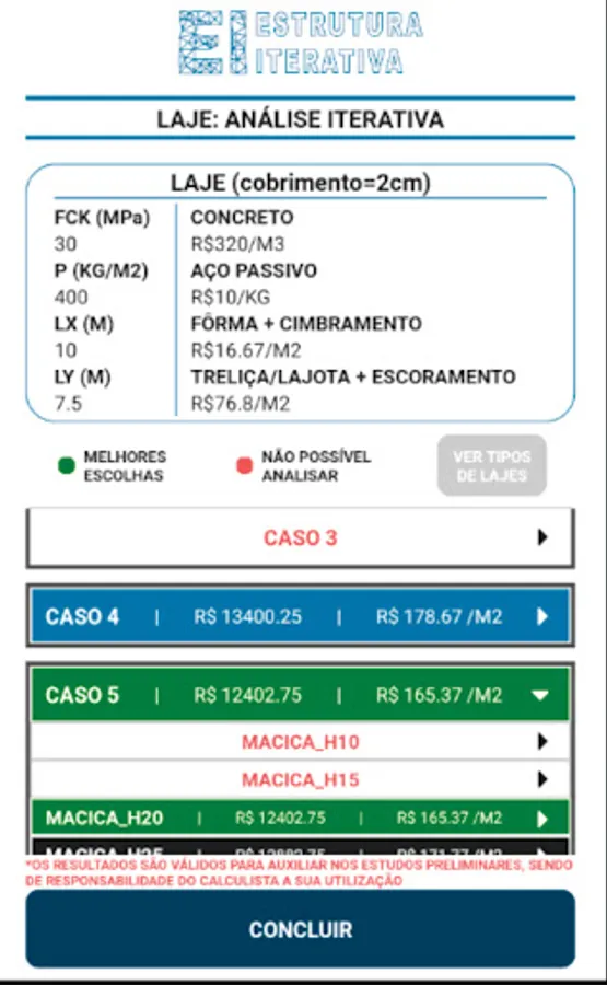 As a result the application generates a report with the results iterating through each type of structural system and highlighting the most cost-effective one from the input data.