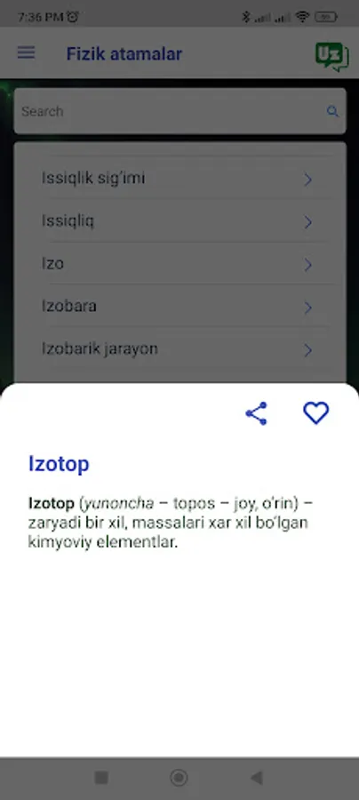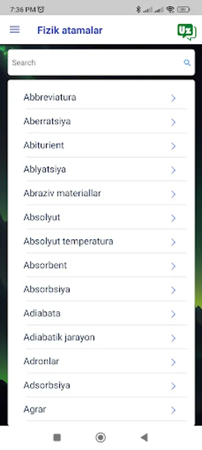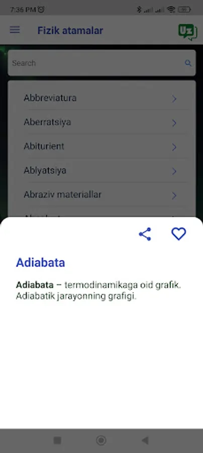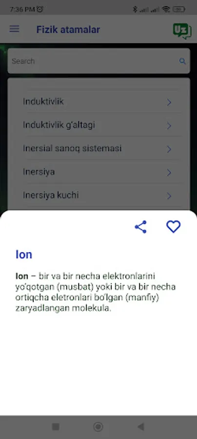 Fizika atamalari lugʻati fizika tushunchalari, nazariyalari va formulalari uchun taʼriflar va tushuntirishlarning keng toʻplamini taqdim etadigan keng qamrovli Android ilovasi. Ilova mexanika, termodinamika, elektromagnetizm va optika kabi turli mavzularni qamrab oladi. Foydalanuvchilar qidiruv satridan foydalanib so‘zlarni qidirishlari yoki kerakli ma’lumotlarni topish uchun toifalarni ko‘rib chiqishlari mumkin. Ilova foydalanuvchilarga tushunchalarni osonroq tushunishga yordam beradigan misollar va rasmlarni ham o'z ichiga oladi. Foydalanuvchilar uchun qulay interfeysi va fizika terminologiyasining keng to‘plami bilan “Fizika atamalari lug‘ati” talabalar, o‘qituvchilar va fizikaga qiziqqan har bir kishi uchun qimmatli manba hisoblanadi.