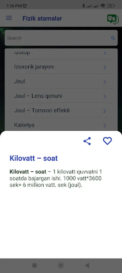 Agar sizga Fizika atamalari lug‘ati foydali bo‘lsa, Google Play do‘konida ilovani baholang va ko‘rib chiqing. Sizning fikr-mulohazalaringiz boshqalarga ilovani topishga va uning ta'lim mazmunidan foyda olishga yordam beradi. Do'stlaringiz bilan baham ko'rishni unutmang, ular foydali bo'lishi mumkin!