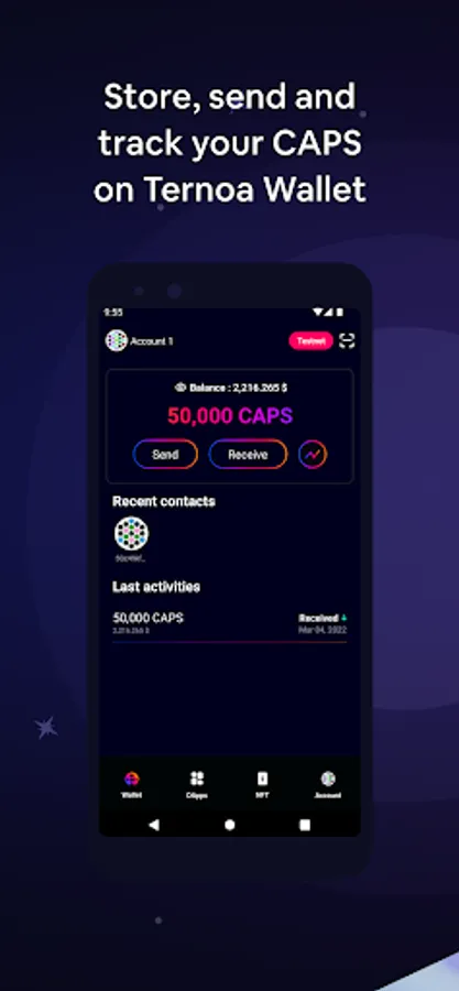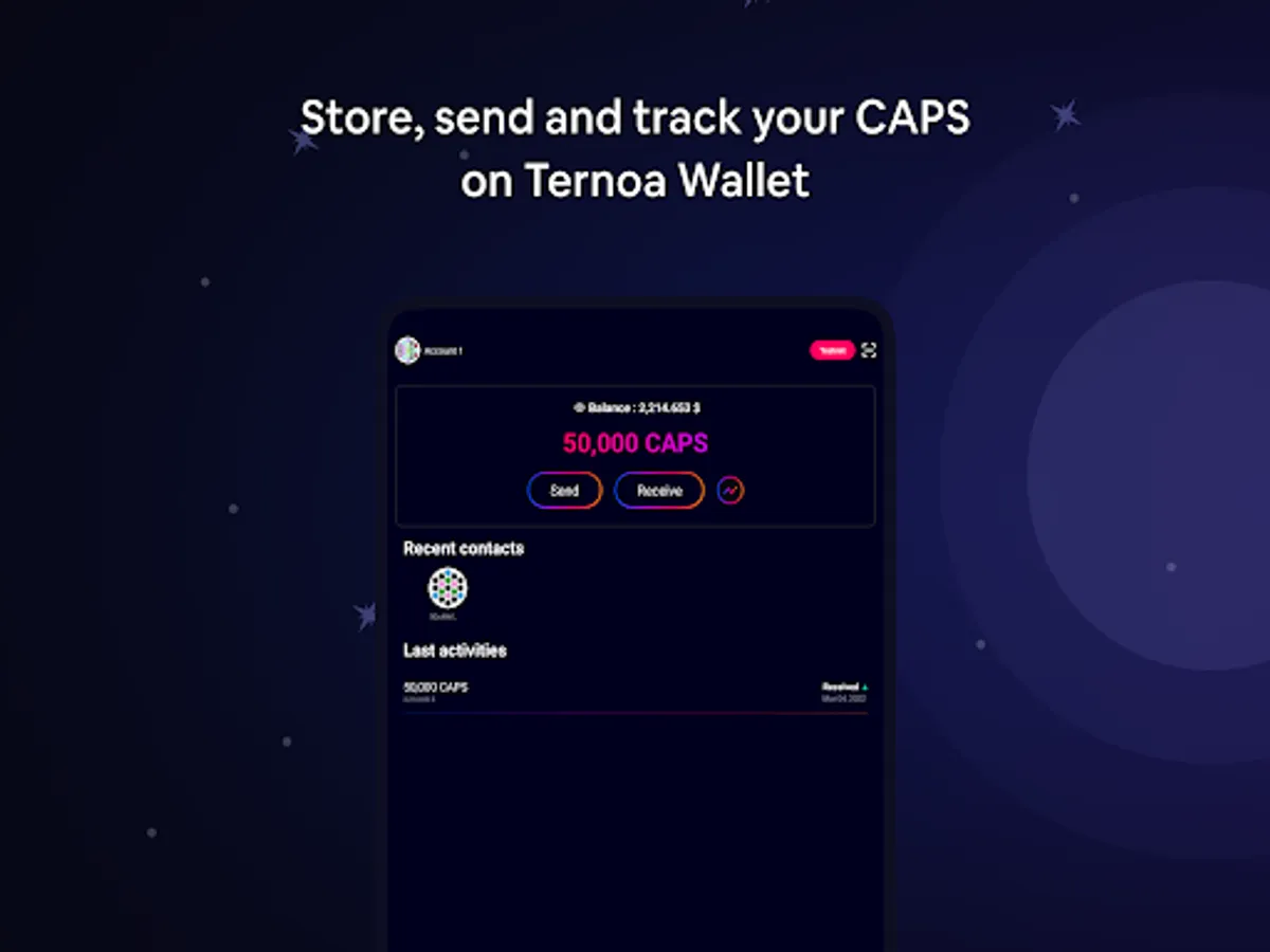 Note that the Ternoa Wallet is on its Beta Version on Ternoa’s testnet, it can only manage test caps, you will have to wait until the App’s main version launch before managing your real CAPS tokens on it.