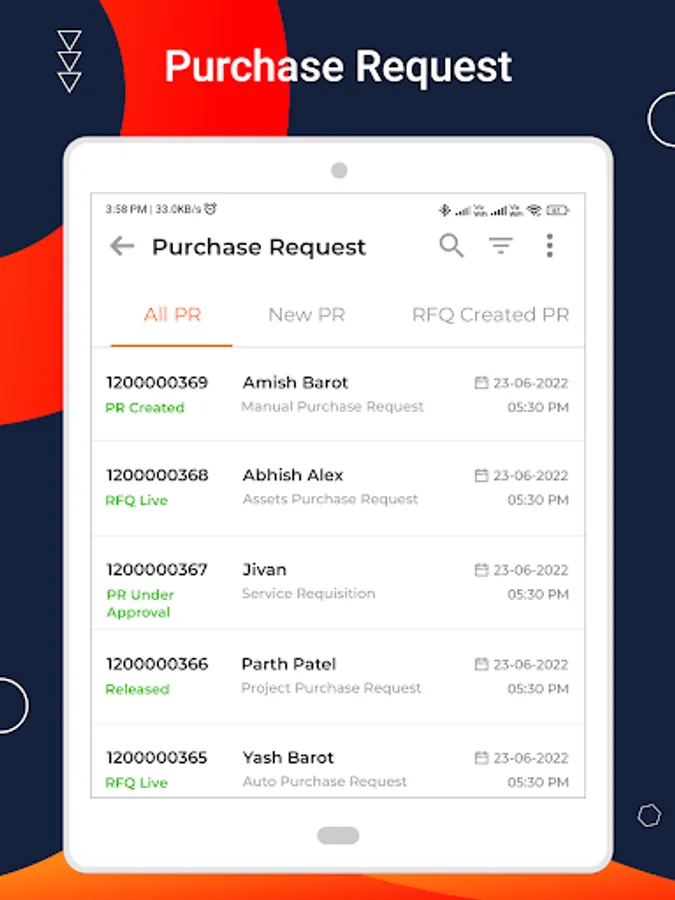 In our app anyone is able to see the listing, where the all-PO list will be available with its status, ‘created by’ and ‘created at’ details. We also have an option to search and filter the data as per the requirements.