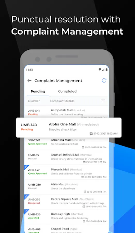 Created complaints show with the pending status to accept the service and take action by providing comments.