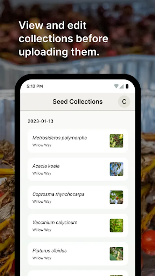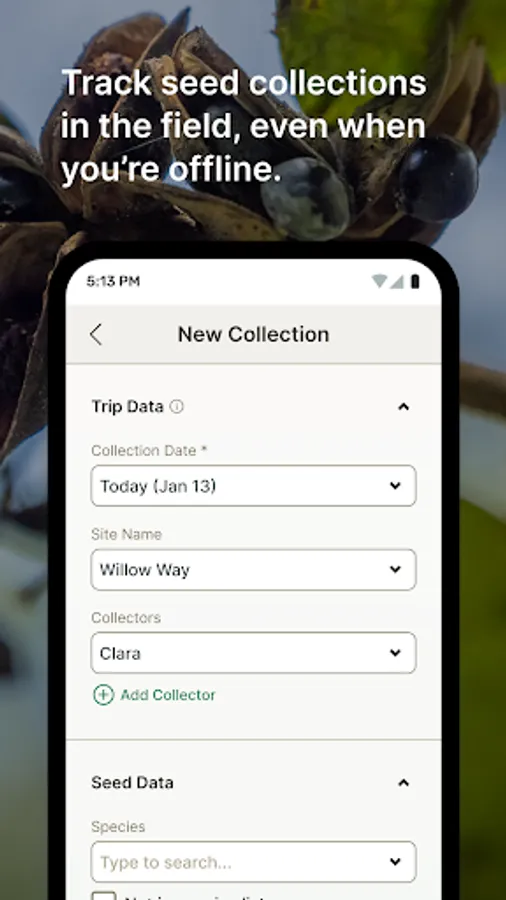 The Terraware seed collection app allows users in the field to gather seed collection data and transfer it directly to their Terraware database. The app allows anyone with a Terraware account to collect data in the field using a simple interface — no need for an internet connection until you need to drop the data off.