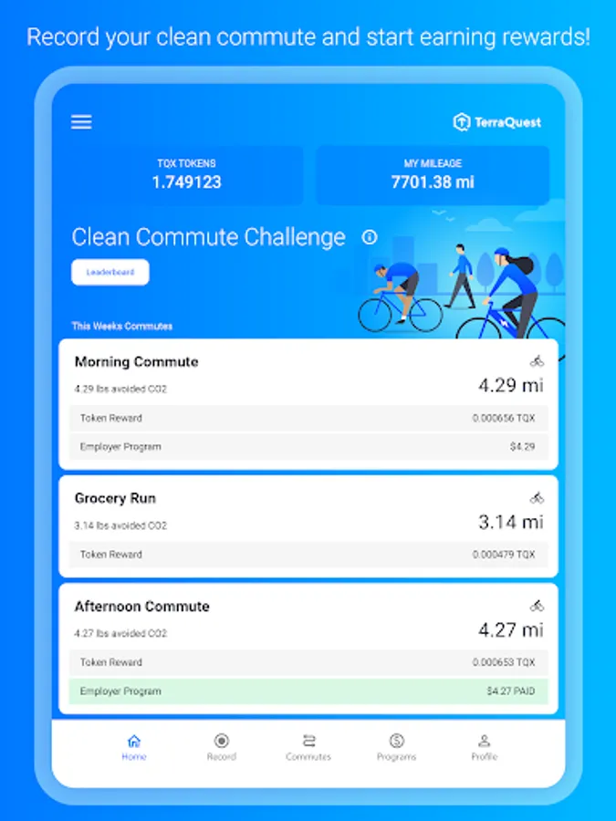 A car that averages 20 mpg generates 1 lb of CO2 emissions every mile it travels. You can take climate action NOW by replacing your car trips with clean commuting (walking, bicycling, e-biking, etc.). Record your clean commutes and track your progress using the TerraQuest Clean Commuting Challenge Leaderboards and TQX token rewards. Our goal is to generate 1 million miles of clean commuting fast.