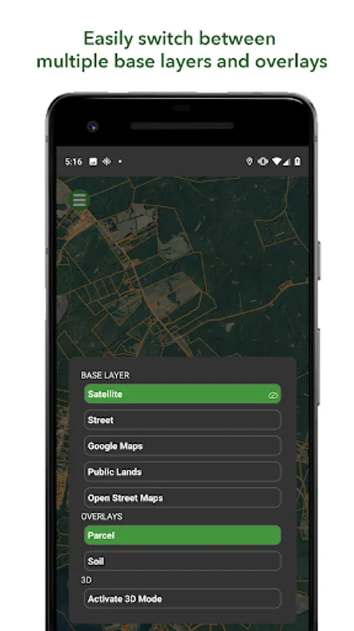 -Select from multiple base layers including Satellite, Street, Google Maps, Open Street Maps, and our proprietary Public Lands Layer. Also gain access to nationwide soil information.
