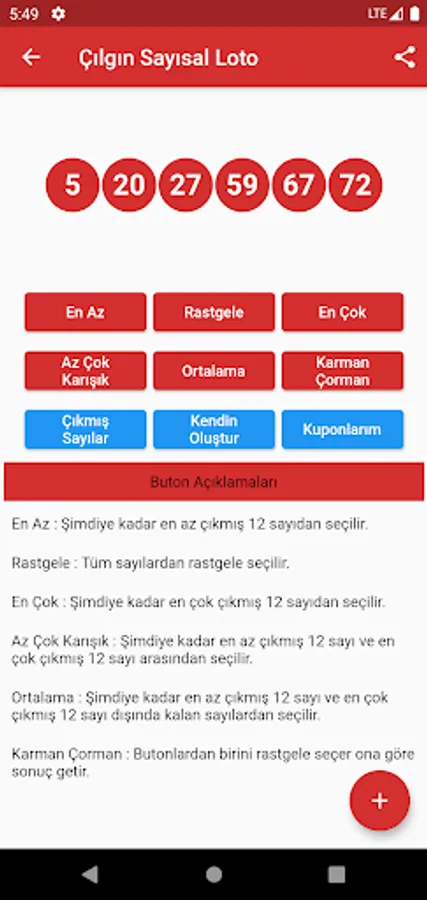 ✔️ With the coupon generation section, you can make a coupon estimate as you want. When generating coupons, you can create coupons by choosing the ones that come out the most or the ones that come out the least. You can see all the numbers that have appeared in the lottery before. According to these analyzes, it can make lottery predictions. This increases your chances of winning in games of chance.