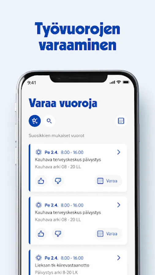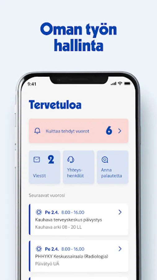 Health care professionals of Terveystalo can manage their work, book open shifts/job periods and manage their personal info.