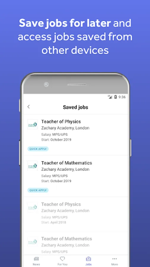 Save jobs: if you’re not ready to apply for a job on your mobile device, you can save it to come back to later, either within the Tes app or on the Tes website.