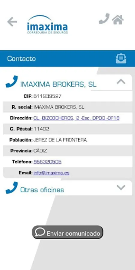 IMAXIMA BROKERS uses the Internet connection (4G / 3G / 2G / EDGE or Wi-Fi when possible) of the Android device of the insured or collaborator to connect the user directly with the brokerage's database, thus allowing access to the updated and real-time data.