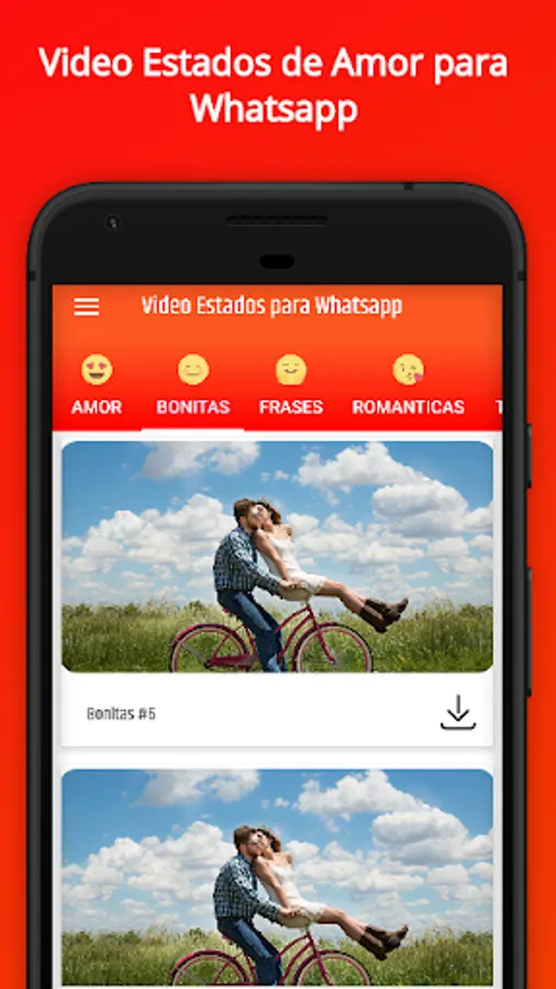 Video status for whatsapp 2020 brings love videos in more than 5 different categories every day. Made to be simple and easy to use, just 1 click for you to download love, pretty, romantic, sad videos, etc ... and other themes to your cell phone gallery or to share in your groups and even in your state by WhatsApp.