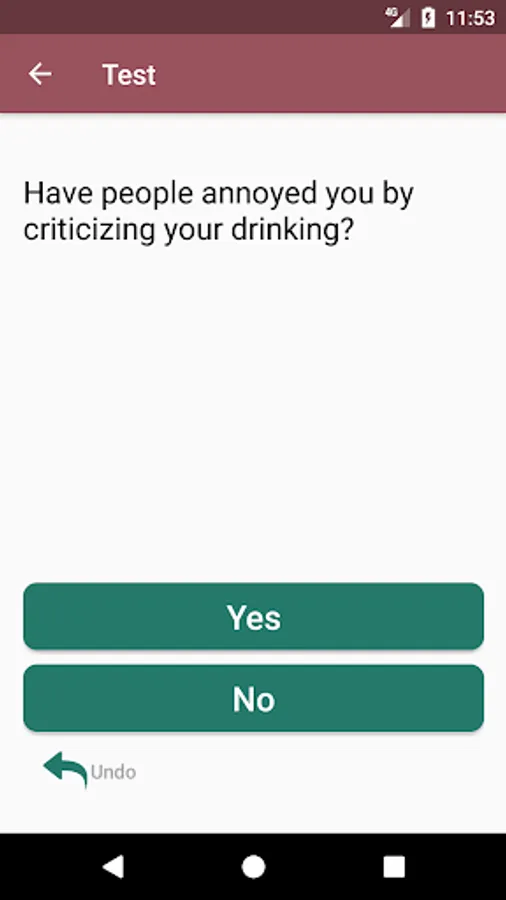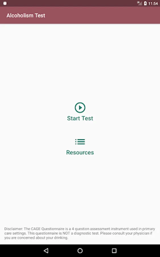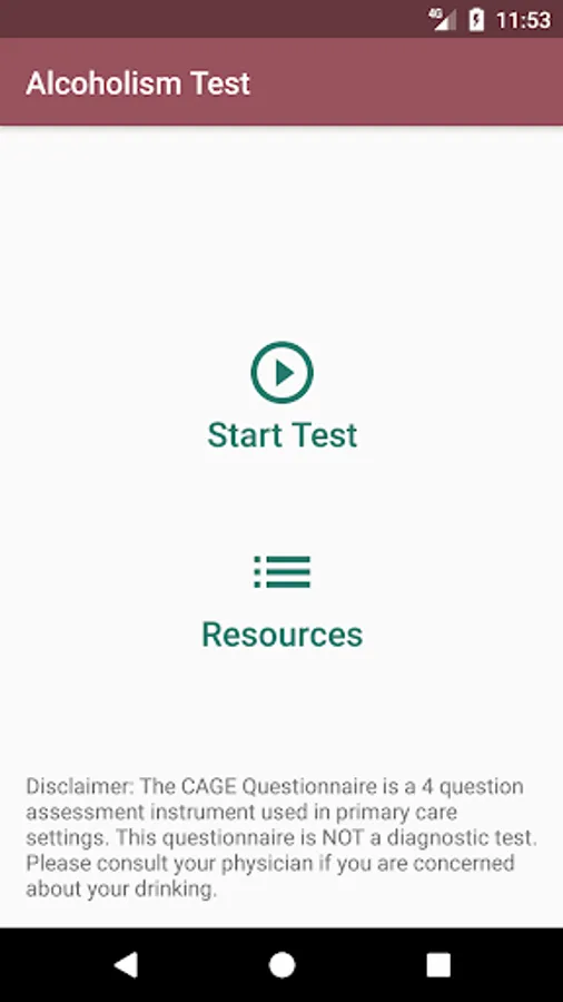 Disclaimer: The CAGE Questionnaire used in this app is a 4 question assessment instrument used in primary care settings. This questionnaire is NOT a diagnostic test. Please consult your physician if you are concerned about your drinking.