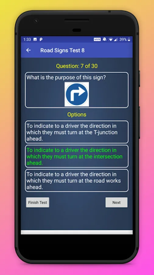 - Road signs, signals, and markings (10 practice tests) (Total questions: 30, Passing score: 23)