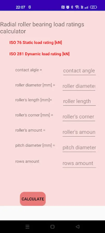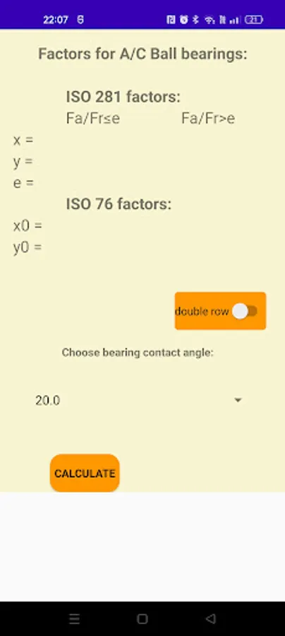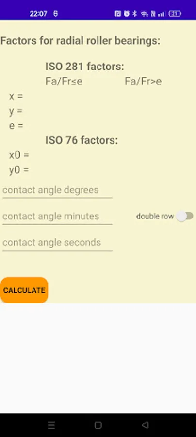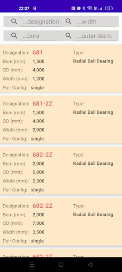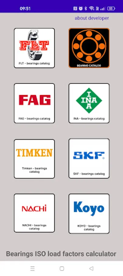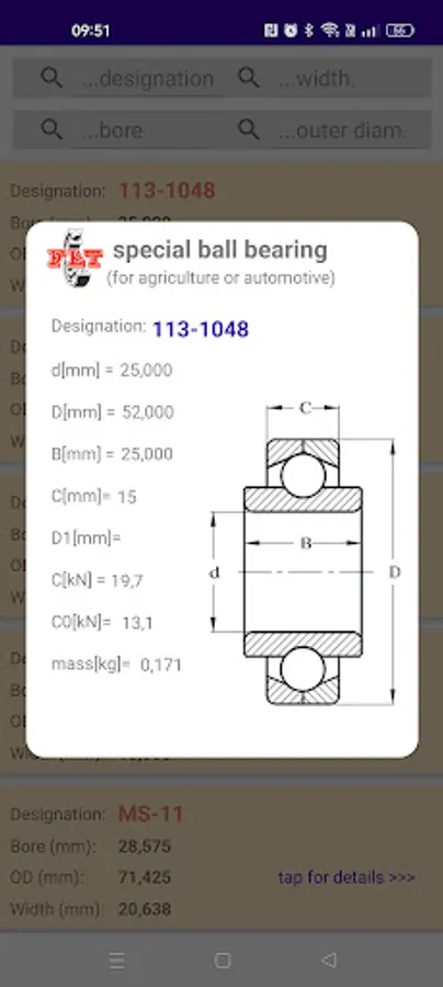 This app contains detailed bearings catalogs including bearing designation and bounduary dimmensios of various manufacturers as FLT, SKF, FAG, INA, KOYO, TIMKEN, NACHI. You can also calculate detailed engineering bearing features as ISO load factors and bearing static and dynamic load rating according to international standards ISO76 and ISO281