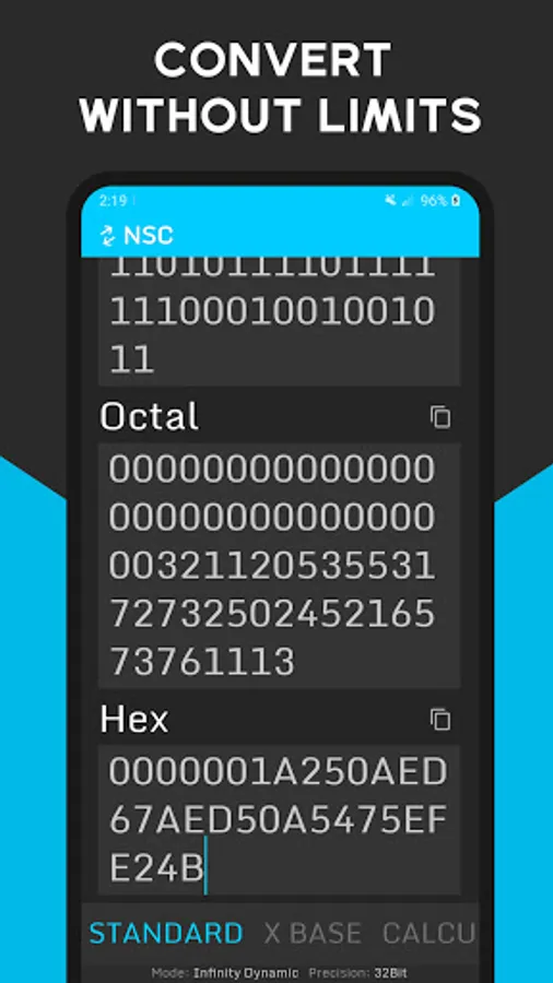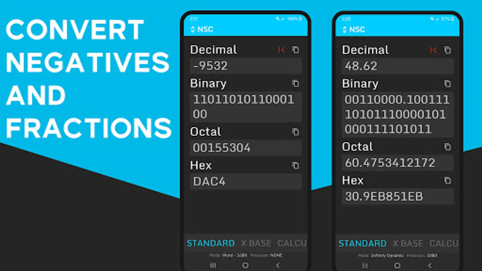 All in one number systems / bases converter and calculator. Convert or calculate Binary, Decimal, octal, Hex and up with support for system bits setting, Fractions and Negative numbers.
