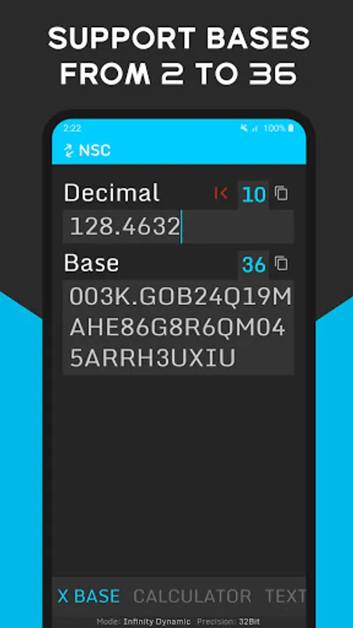 • Convert Decimal, Binary, Octal, Hexadecimal and Bases up to 36
