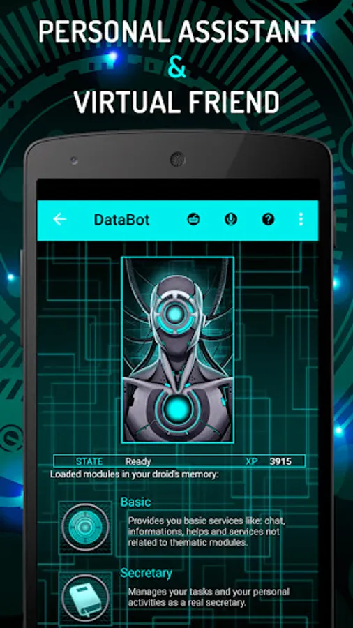 Voice assistant DataBot is the most friendly artificial intelligence app for android! Ask your friend robot AI anything you want, like Jarvis, the assistant answers with its voice to your requests upon topic you are interested in. Apps and services integrated inside the artificial intelligence of your assistant give back to you images, voice search and multimedia presentations.