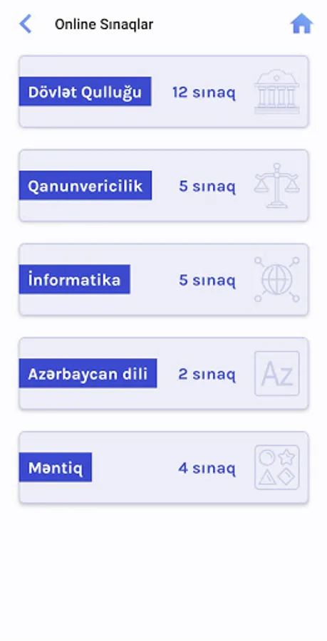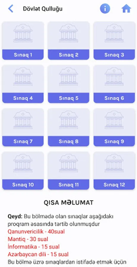 Subjects and tests on Legislation, Azerbaijani language, Logic, and Informatics programs for candidates preparing for the Civil Service Entrance Exam held by the State Examination Center have been collected in this program. It is possible to do online tests by collecting coins (points) in the program. This program is an additional resource for those who want to become a Civil Servant.