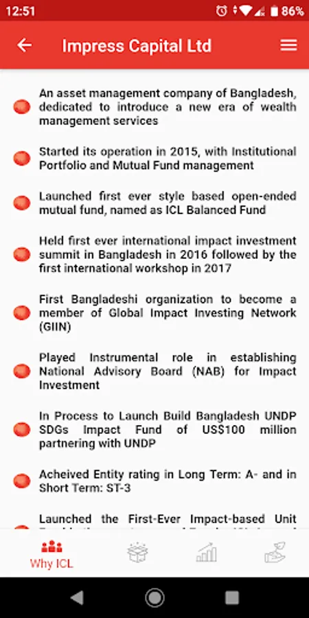 Impress Capital Limited (ICL), an Asset Management Company of Bangladesh, dedicated to introduce a new era of Wealth Management Service, started its operation in 2015 with Institutional Portfolio and Mutual Fund Management. At present, ICL offers Primary and Secondary Investment Management along with Advisory Lead services. iVest is an investment app for the investment solutions managed by ICL. The existing and the potential investors of ICL will be updated with the daily investment news through this app.