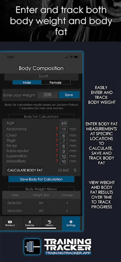 Training Tracker is also designed to allow users to enter and track body composition. Whether you are trying to lose weight, gain muscle or just track body fat levels. Body fat calipers can be purchased from Training Tracker.