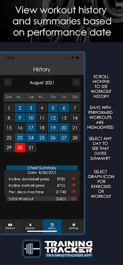 History calendar displays highlighted dates of recorded workouts allowing selection and review of any specific day’s workout and recorded workout volumes.