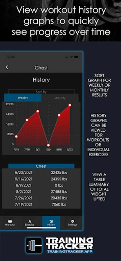 History graphs provide simple progress display of recorded total volumes lifted for workouts or specific exercises.