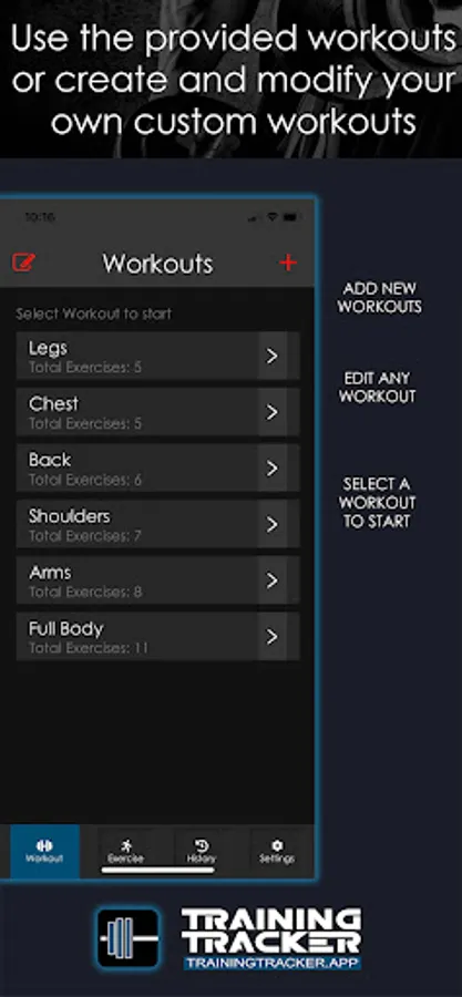 The design of Training Tracker’s interface makes it simple to navigate. A few exercises and simple workouts come preloaded in the app for use. You can use them as they are or edit them to fit your needs. This apps interface allows you to easily enter your own exercises. You can give them any name you like and use them to build your own custom workouts based on your typical gym routine, or any new routine you would like to log and track.