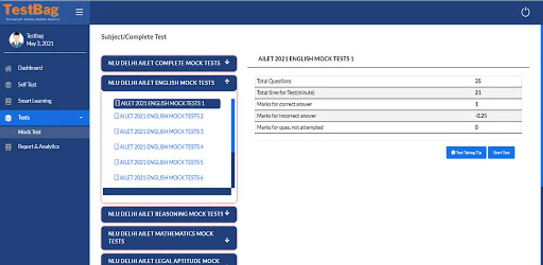 TestBag provide AILET Free online Sample Mock Practice Test Papers, Test series, old Paper & many more based on latest Exam Pattern and syllabus