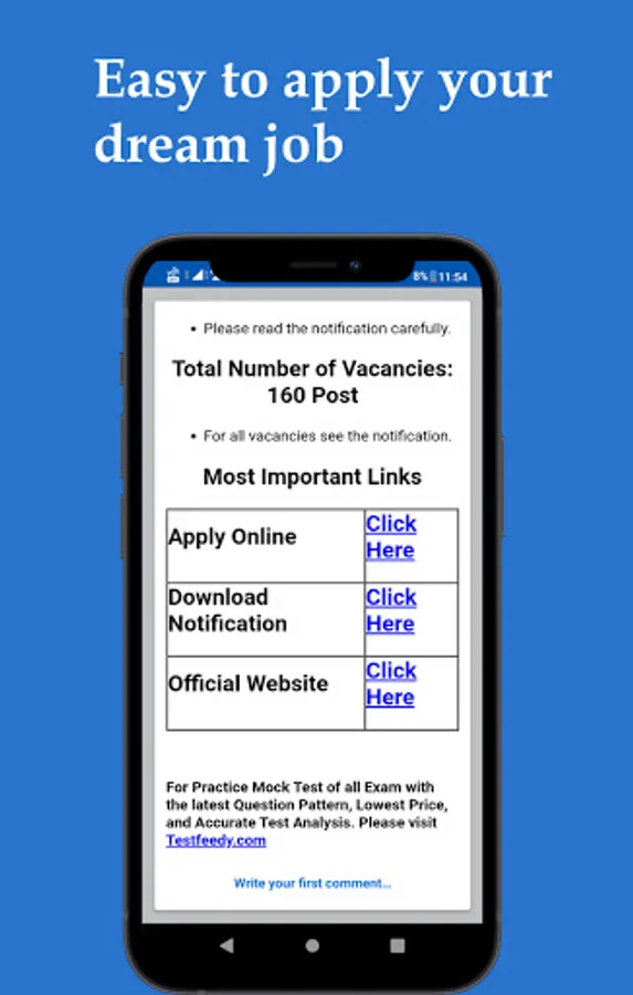 Testfeedy Blog app, provide the information to users about employment news from government/organization official website of various exam, Admission, Results, syllabus, admit card categories. Such exams are SSC, Banking, Railways, Police, Teachers, Defence (Army, Airforce, Navy), State government jobs, UPSC, BPSC, Engineering and medical sectors etc. So, users can find all jobs related information at one place. we can just provide information. We do not take any information except name and email id.