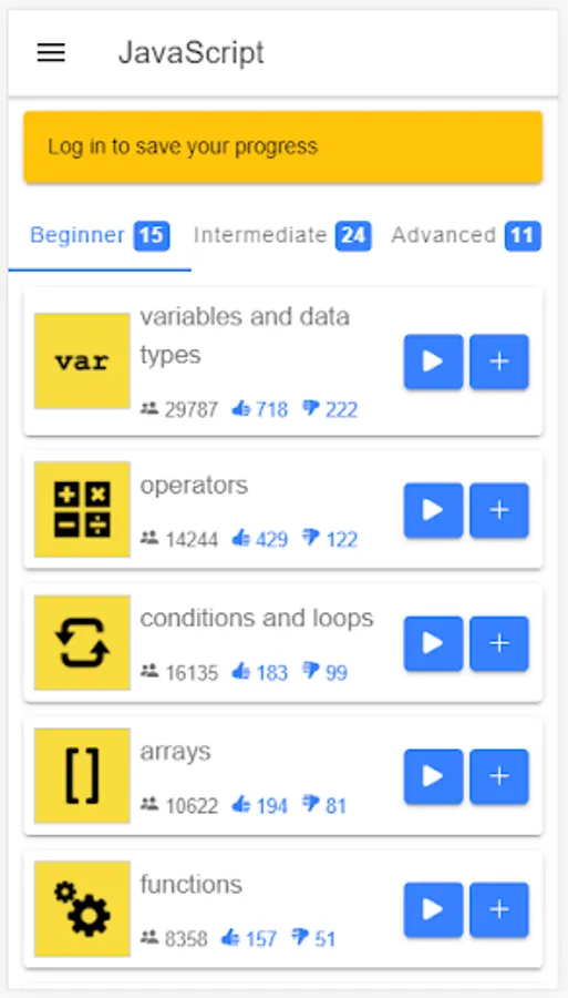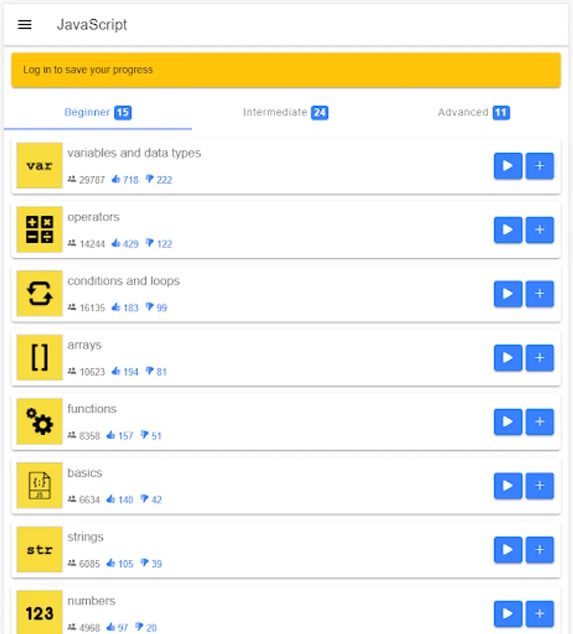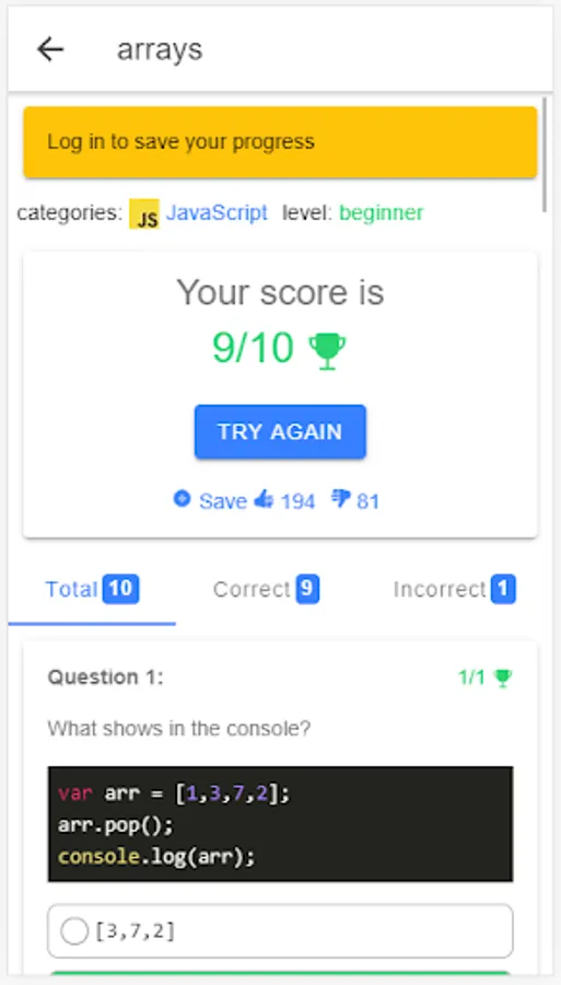 Quizes and questions are divided by the level: beginner, intermediate and advanced.