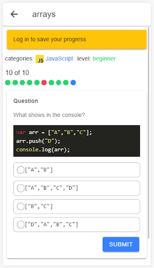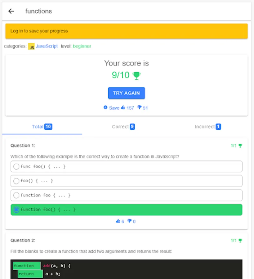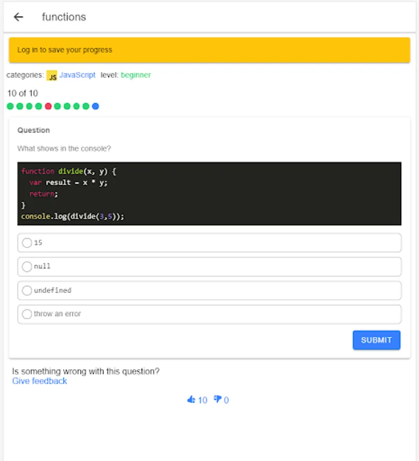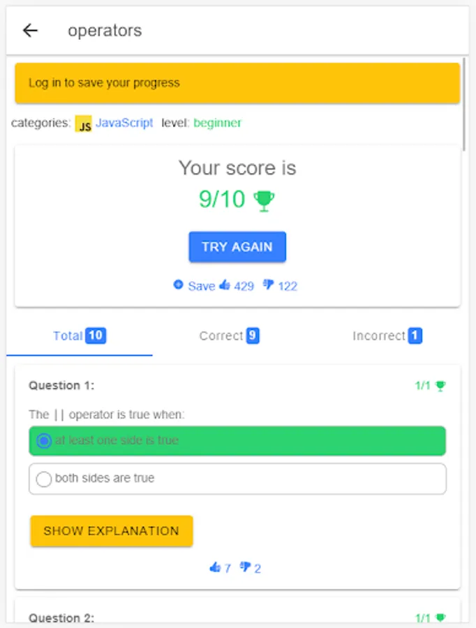 - Learn and improve your JavaScript skills and knowledge by reading explanations assigned to each question to help you understand the concept