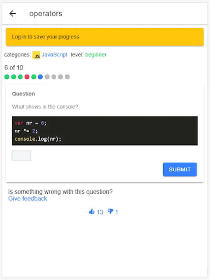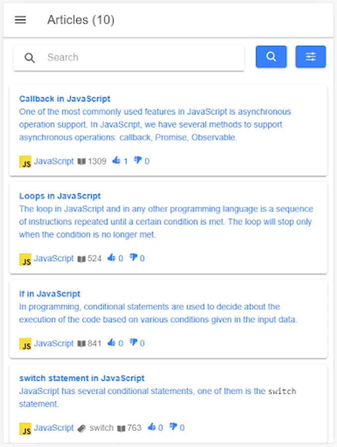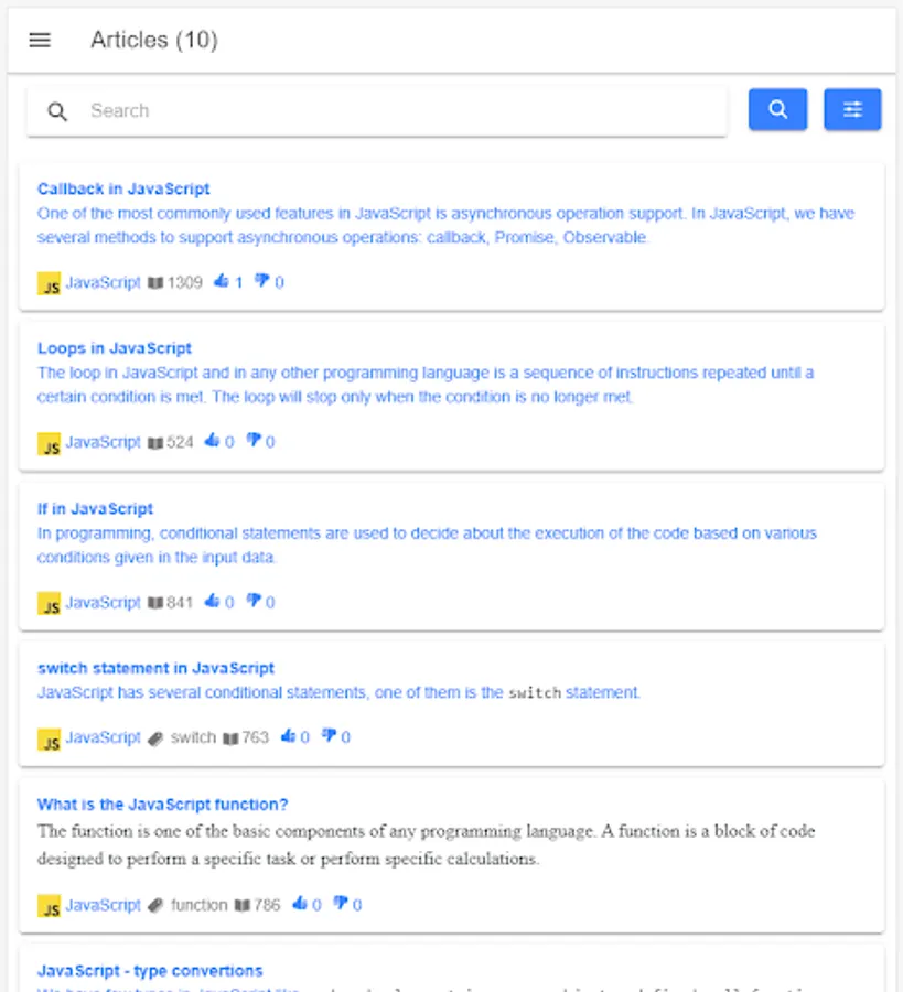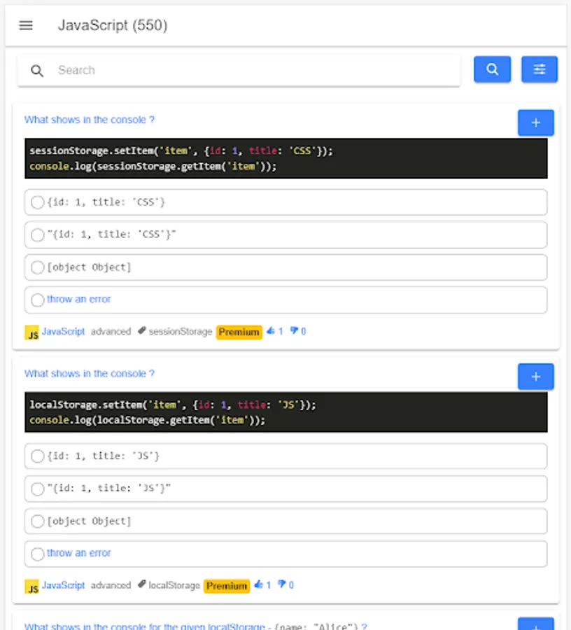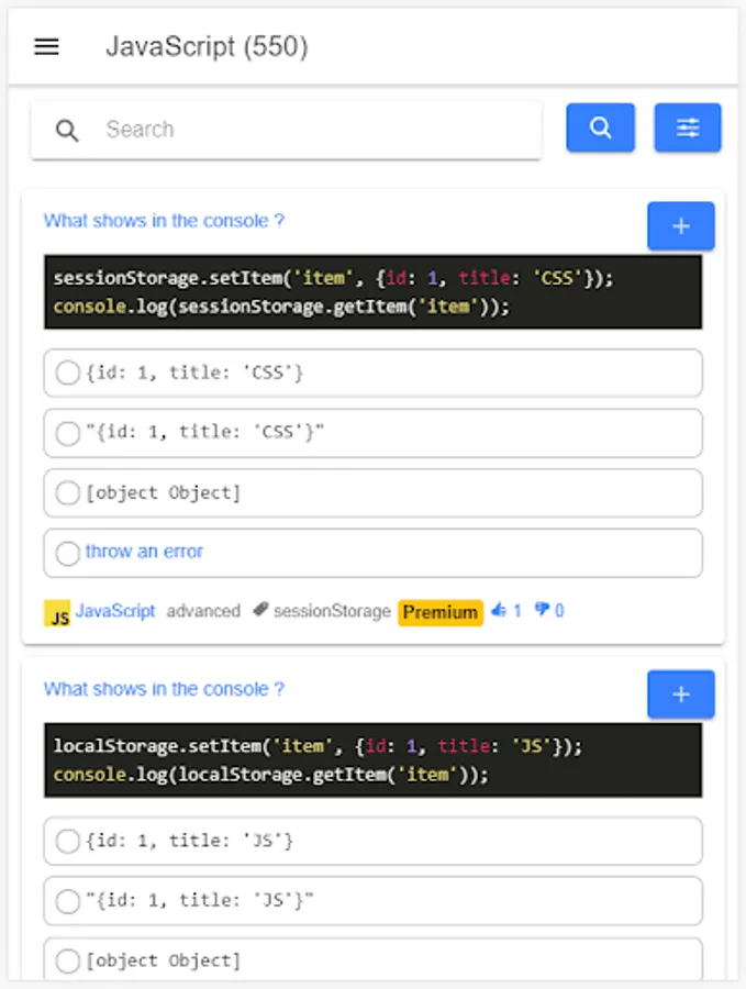 Whether you are an experienced or beginner frontend programmer, this application is for everyone who wants to learn and expand their knowledge of the JavaScript.