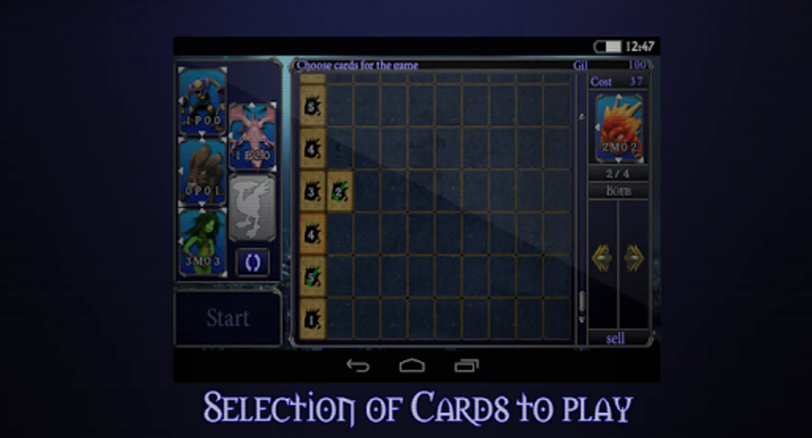 Each card has attributes of attack, defence, attack method (physical of magical) and direction of the move.
