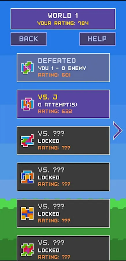 In the Versus AI game mode, there are two modes: matchmaking and adventure. In matchmaking, the player faces a randomly generated enemy AI that is close to their Elo rating. This enemy has a given amount of health points that can be diminished from the player clearing lines to form attacks. The enemy attacks by sending the player gray garbage lines in an attempt to make the player place blocks above the board, which then they would lose. The higher the Elo of the enemy, the stronger it is, and it will also sometimes use special abilities to deter the player. The player's Elo rating will change depending if they win or lose the battle. In the adventure mode, players battle an enemy with fixed rating and strength. If they win, they advance to the enemy. The enemies in adventure mode have more predetermined attacking sequences so the player can better prepare for them.