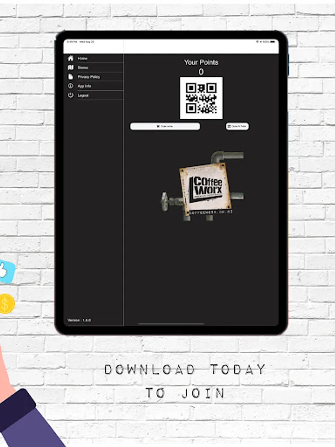 Using the app by scanning the QR code in conjunction with the Tevalis Point of Sale system at Coffee Worx venues will allow you to earn and redeem loyalty rewards based on your purchases.