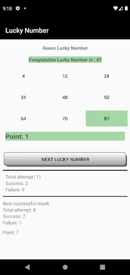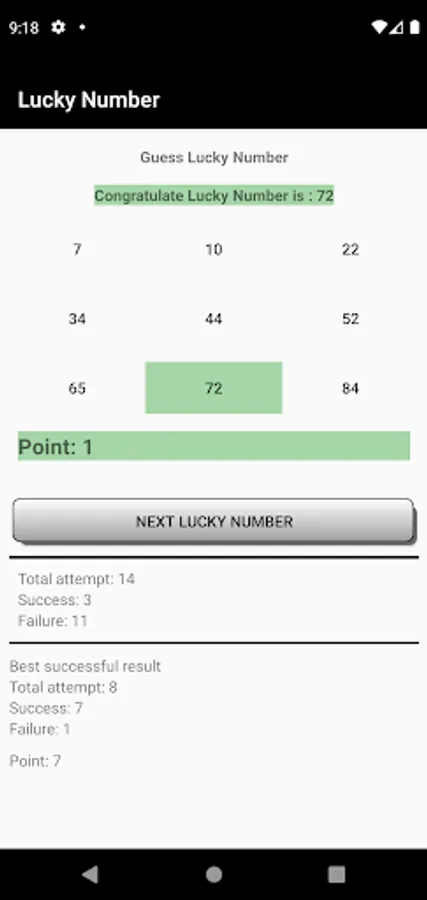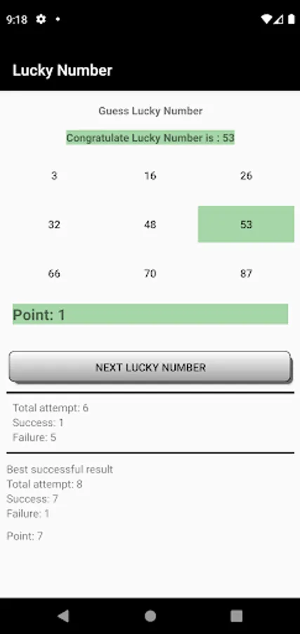 If a user clicked a button and randomly generated lucky numbers equal each other in this case Point counter would increase by one and store the mentioned information.