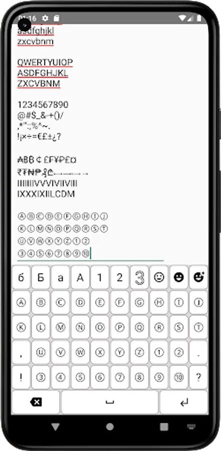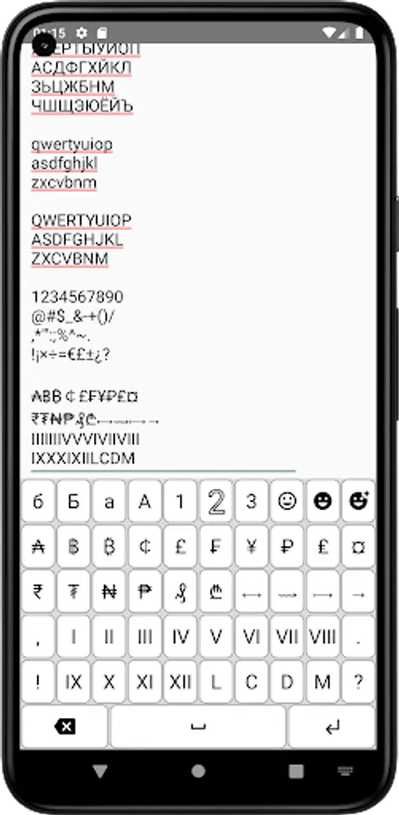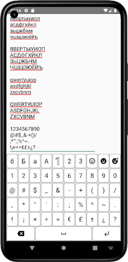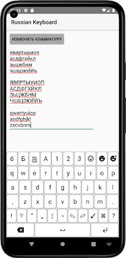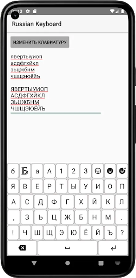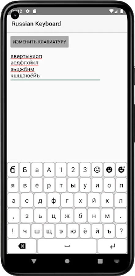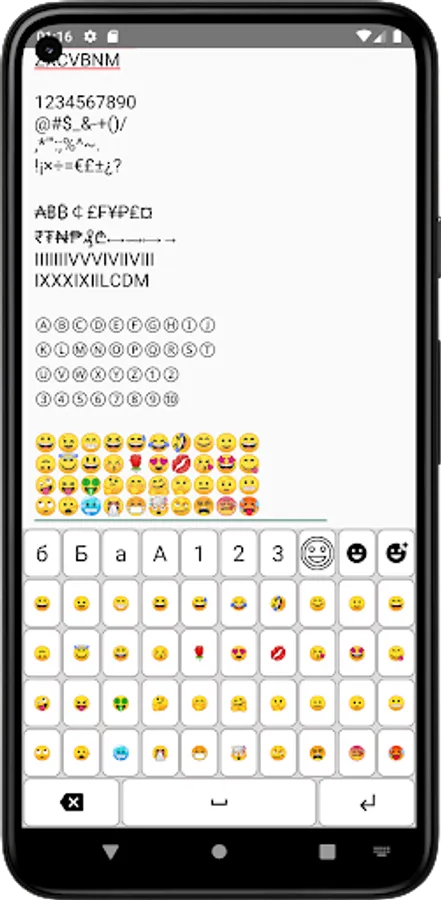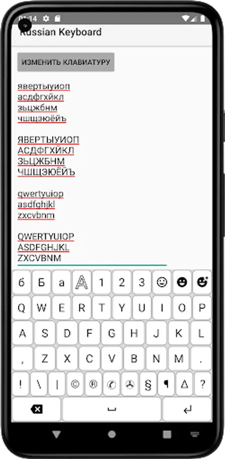 The application includes a total of 10 different layers: Russian lower, Russian upper, English lower, English upper, numbers and 3 common symbols, 3 emoticons.