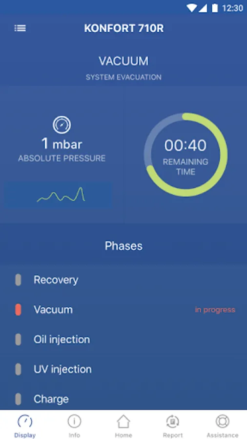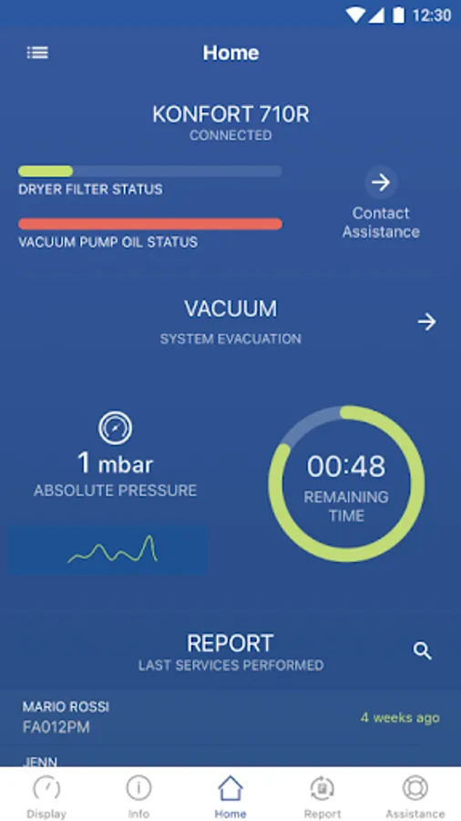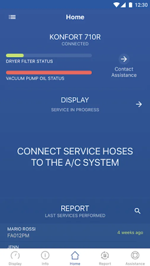 The APP allows TEXA KONFORT charging stations to interface with the smartphone and allows the technician to follow the A/C system service procedures also remotely, directly from the smartphone display. A specific notification system will alert the technician when the service is completed or when the Konfort charging station detects any failures in the A/C system. Furthermore, thanks to its intuitive user interface, the performed maintenance services can easily be checked and managed even when the station is switched off.